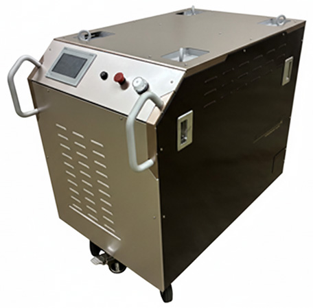 インフラレーザ®シリーズにおいて、屋外運用にも最適な光出力2kWの定置システムを製品化し、本年10月29日より受注を開始します(図1~3)。本製品は従来型の小型定置システムと比べて光出力が約2.8倍の2kWとなり、レーザの照射範囲が広がることから、鉄道車両台車の塗膜除去作業では施工速度は約3倍に向上します(表1、図5)。また、700W定置システムでは施工自体が難しかった、タンク、船舶、橋梁分野での塗装・錆除去、電力分野では火力発電所のタービン修繕時の酸化スケール除去、工場ではアーク溶接時のスラグや溶接焼けのクリーニングにも対応します(表2)。