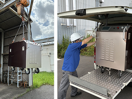 本体の外装・フレームなどの機構部品は腐食対策と防水仕様を施しているため、造船所など塩害が発生する地域でも長期的に屋外で利用できます。アイボルトを備えているためクレーンで運搬でき、キャスタ付きのため、人力での普通車サイズのバンへの積み込みや平地での移動も容易です(図4)。本製品は当社千葉事業所内のインフラレーザラボとお客様のご要望に応じた出張での実演デモにも対応します。