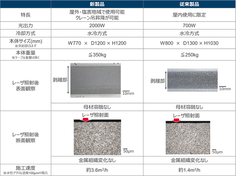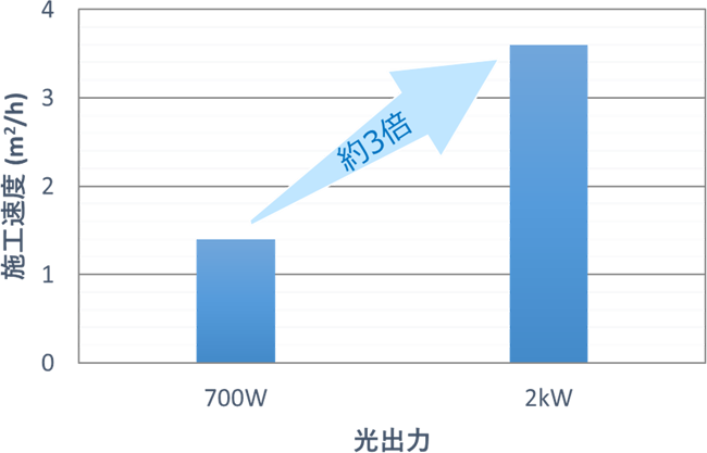 - 高出力化でレーザの照射範囲が広がることから、塗膜・錆の除去作業など施工速度が約3倍に向上