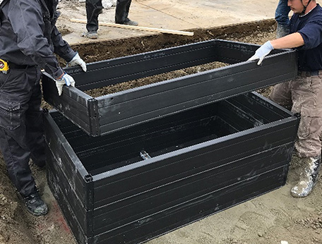 ROM-Box™の樹脂製の本体は同等サイズのコンクリートハンドホール(縦600mm×横600mm×高さ600mm、約500kg)と比較して1/7程度の重量(全体約67kg / 1部材23kg以下)と軽く、段積みしてクリップとボルトで固定するだけで組み立てられるため、作業者のスキルによらず安全に施工することができます(図3・4)。本製品は、軽量な樹脂製の本体部分と高強度な鉄蓋(従来タイプは樹脂蓋)で構成され、T-8の耐荷重性能を有することから、公道以外の工場構内や発電所、駐車場などの車両通行場所にも設置することが可能です。これにより軽量な樹脂製ハンドホールの活用範囲が拡大され、さらなる、工期短縮や作業負担軽減につながります。